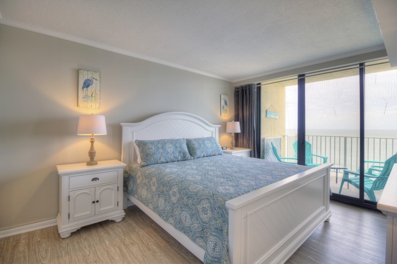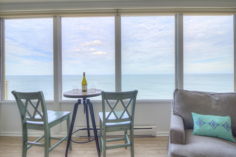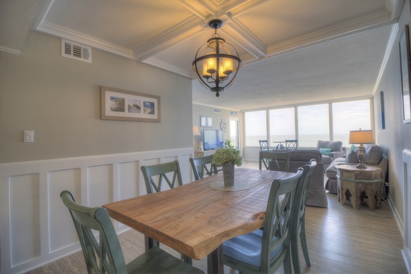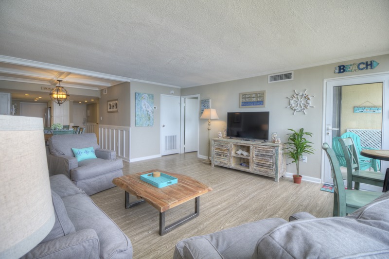 Our beautiful renovated condo has a new kitchen & two new baths, and all new coastal style furniture and decor throughout making this condo a perfect place to enjoy your vacation. Our condo is furnished with one king sized bed in the master suite with a 44” TV and DVD player, and two full-sized beds in the second bedroom. The living room is comfortable and inviting for watching the 50” smart TV and DVD player. Our Kitchen is fully stocked and has bar seating and a dining room table to seat six. The bistro table inside and the adirondack chairs on the balcony give you the perfect spot to admire the amazing oceanfront views!