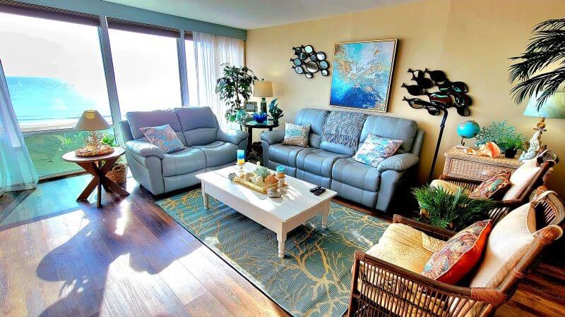 The Master Bedroom is equipped with a king-sized bed accented with a beautiful starfish headboard and a private full bathroom. New full view sliding glass doors open out to the balcony. The guest bedroom is equally spacious with a queen-sized bed and two bunk beds, all with new memory foam mattresses and comfortable bedding. A second full bath is adjacent. There are flat screens and plenty of closet/storage space in both bedrooms.
